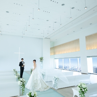 【ワンフロア貸切のスカイチャペル】ホテル最上階にあるチャペル。最も景色が美しく見えるゲスト席で挙式を体験できる。天空のチャペルで誰もが憧れる花嫁に。