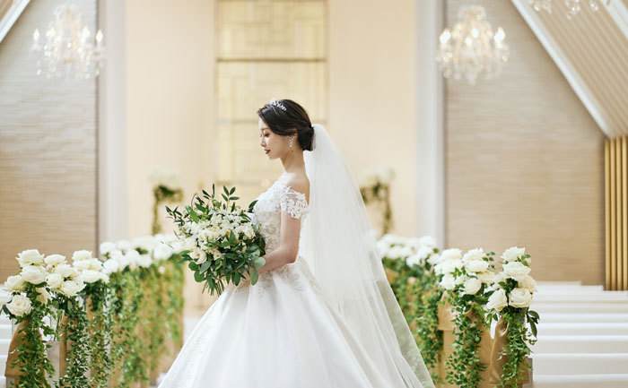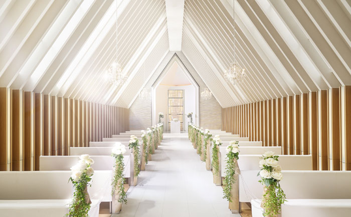 温かな光がふたりを包む、清楚で可憐な白を基調にしたチャペル。