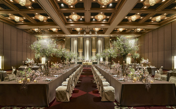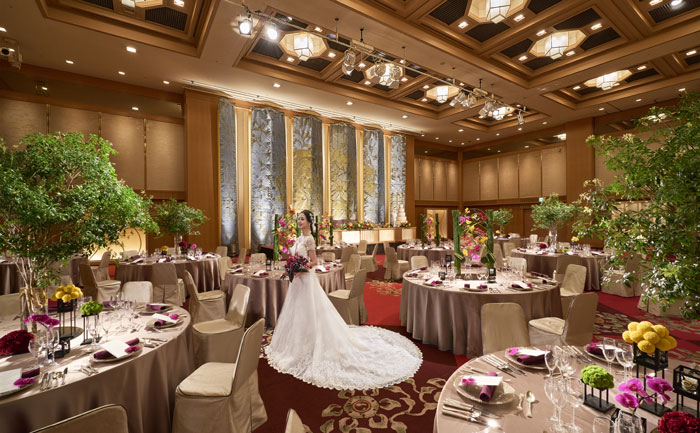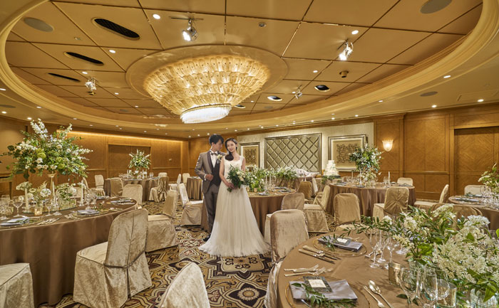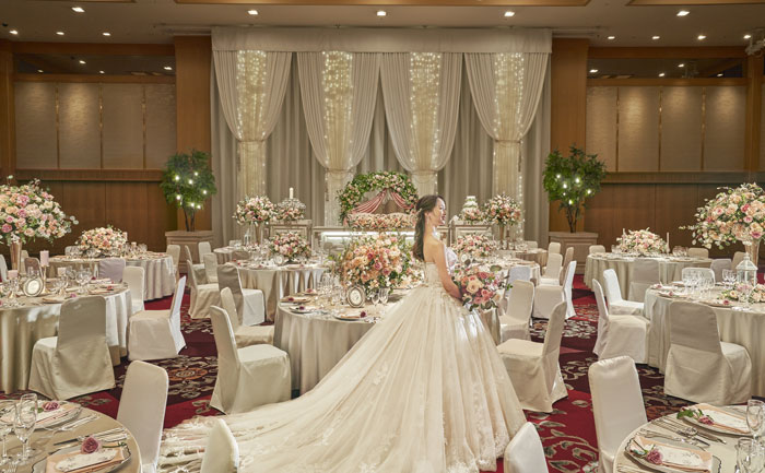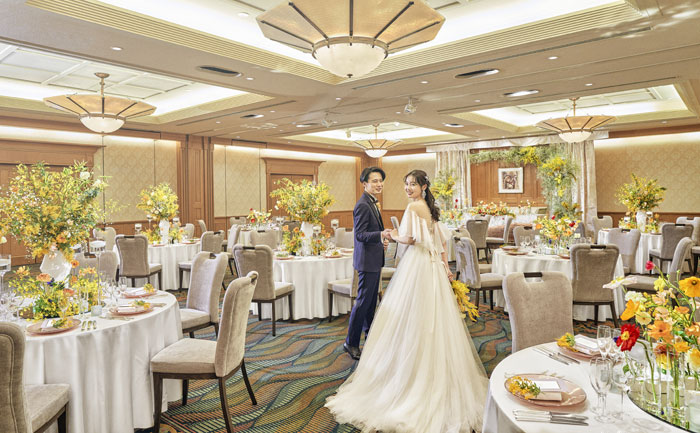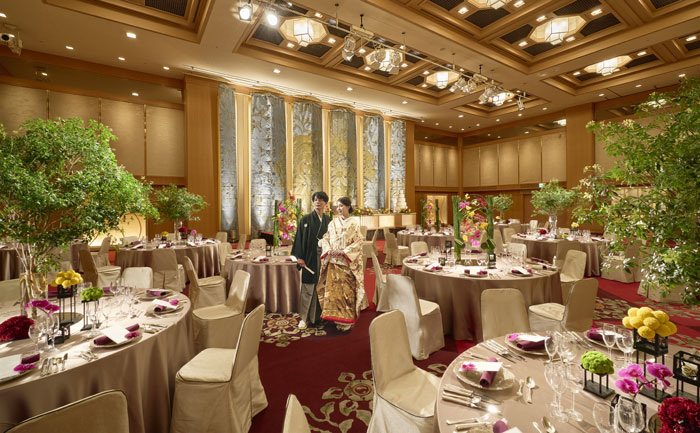 会場の広さと高さを活かし、壁一面をダイナミックに使った3Dプロジェクションマッピング感動の演出が可能な大宴会場や、モダンな和洋スタイルの新コーディネート、永遠の誓いをテーマに光が煌めく幻想的な空間演出など、多彩な世界観で祝宴を創り上げられる。