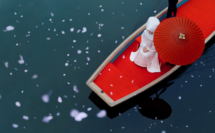 ホテルオークラ福岡だけの懐かしくも新しい「花嫁舟」の演出は、美しい日本の結婚式の原風景。