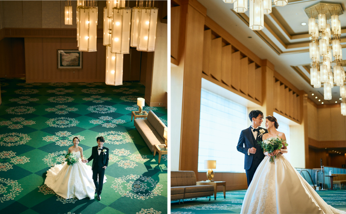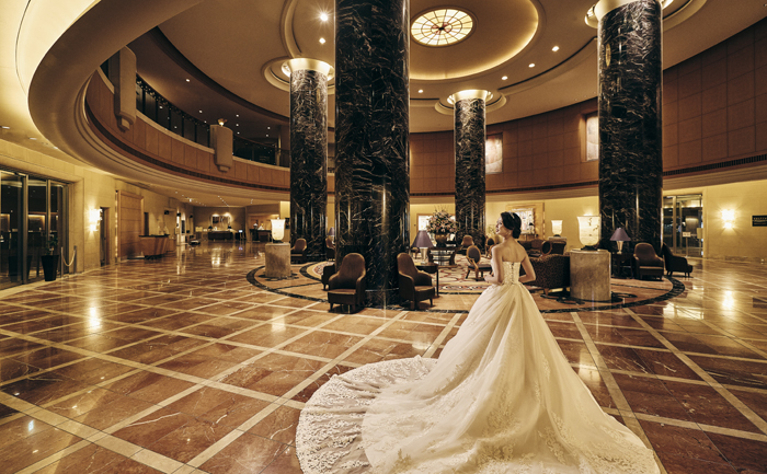 重厚な吹き抜けのロビー空間はホテルウエディングならではの一枚。