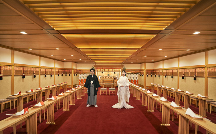 日本の伝統美にモダンをプラスした神前式場は50名が参列可能。
