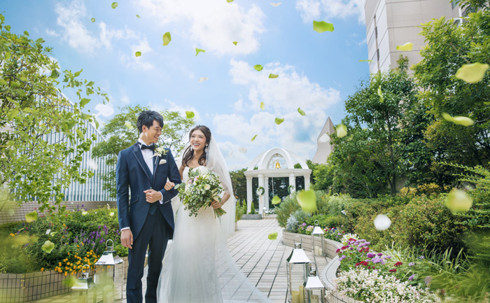 青空の下で緑いっぱいのガーデンでナチュラルなふたりの笑顔を。