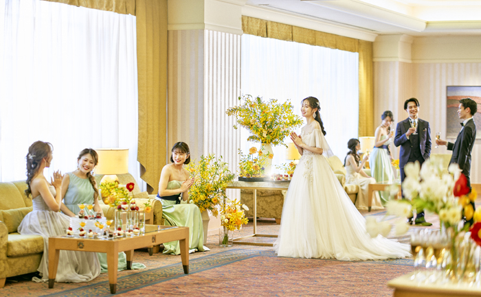 贅沢なホワイエでウエルカムドリンクを片手に和やかな時間を。