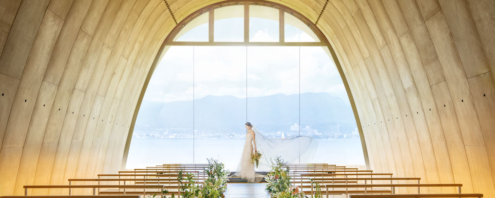 最寄駅のJR堅田駅まで、京都駅から20分。琵琶湖の目の前、比良の山並みを望む立地のリゾートホテル。木の香りに包まれたチャペルは珍しい楽器建築で、風の音を奏でる。琵琶湖が結婚式の舞台の一部となるクルーザー入場はゲストへのサプライズに最適。婚礼料理はこの地にしかないこだわりの食材を使っており、ゲストも思わず舌鼓。雄大な絶景に囲まれたプライベートリゾート感たっぷりの「自然と調和する結婚式」を楽しんで。