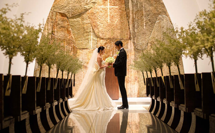天然石で築いた祭壇を静かに流れる水の音、幻想的に映し出される光の十字架。荘厳で神秘的な雰囲気のなかで挙式が叶う。