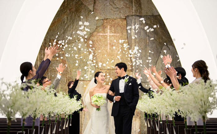 退場はフラワーシャワーで。花びらと共に、特別な日に集う大切なゲストから心からの祝福が降り注ぐ。