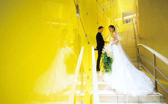 バンケットフロアへ続く階段で。印象的な黄色い光に包まれて、アーティスティックな1枚を。