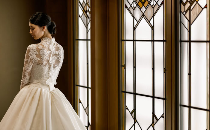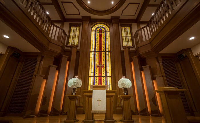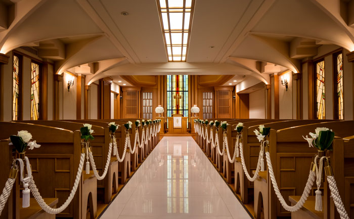荘厳なステンドグラスから射し込む光と、温かな木の温もりを感じるチャペル。白大理石のバージンロードにはステンドグラスが美しく映り込む。日本で初めて夫婦の神様を祀る多賀大社から分祀した神殿での儀式は厳かな雰囲気に包まれる。