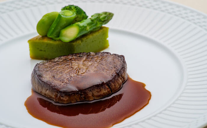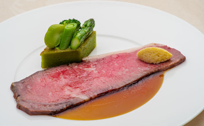 「牛フィレ肉のポワレ 芳醇な赤ワインソースで」は、やわらかな赤身肉のステーキ、ケーキに見立てたガルニチュールを添えて。 -