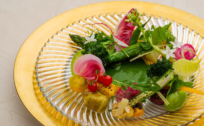 「色とりどりの野菜のパレット グリーンアスパラガスのジュと一緒に」は、30種類もの野菜・ハーブ・食用花を 素材が最もいきる調理法でお届け。 -