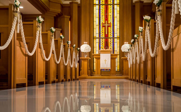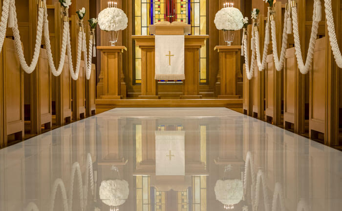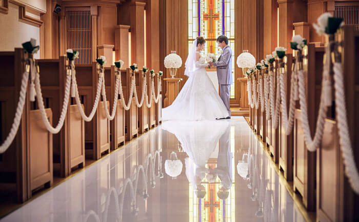 白大理石のバージンロードにはステンドグラスとふたりの姿が美しく映り込む。