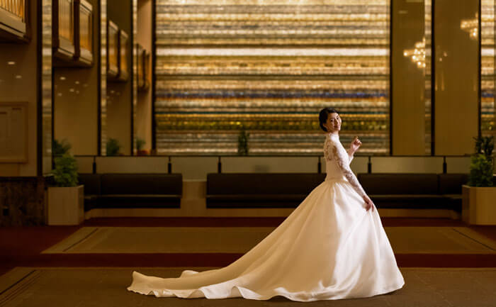 ホテルを象徴するフランク・ロイド・ライトの意匠が施されたプロムナードで、ここならではの1枚を。