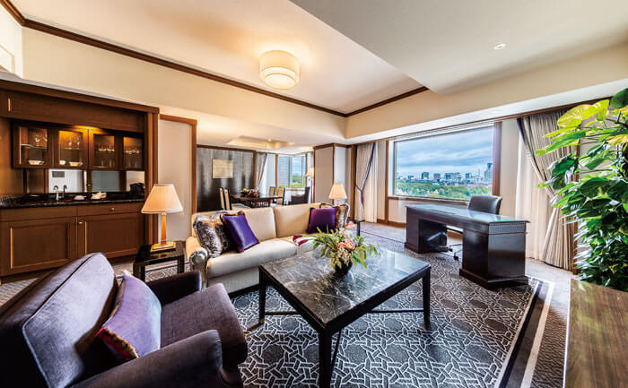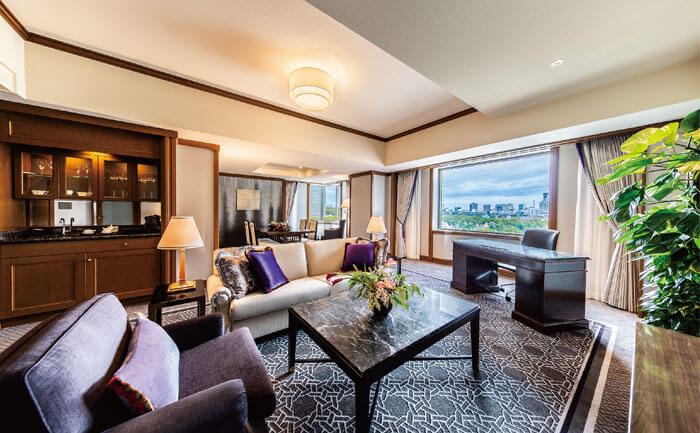 日比谷公園の景色を望むパークビューコーナースイート。非日常を感じられる空間。