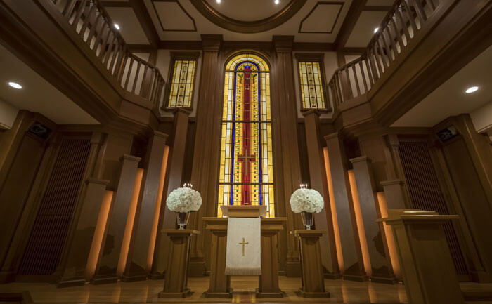 壮麗なステンドグラスから差しこむ光に包まれて。