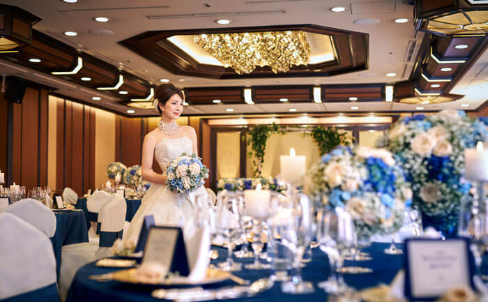 ローズをモチーフにしたシャンデリアと、優しい光を放つロイヤルブルーの絨毯が美しい花々を引き立てる。