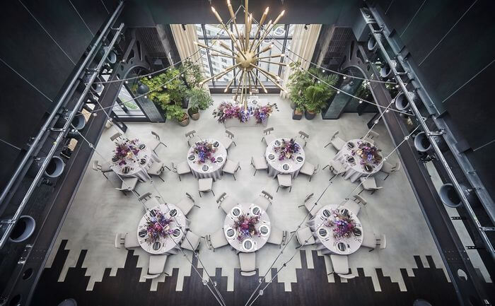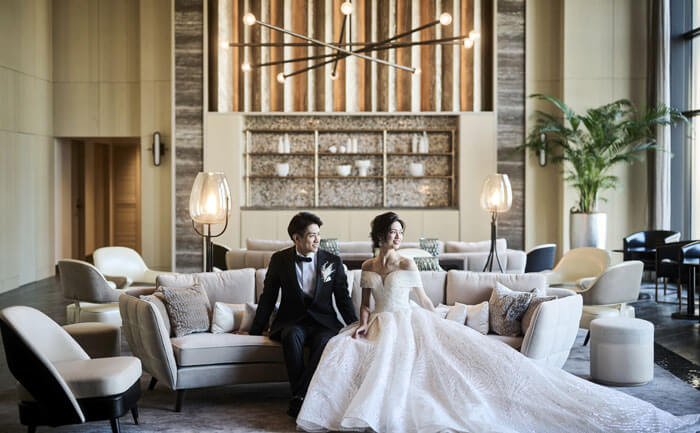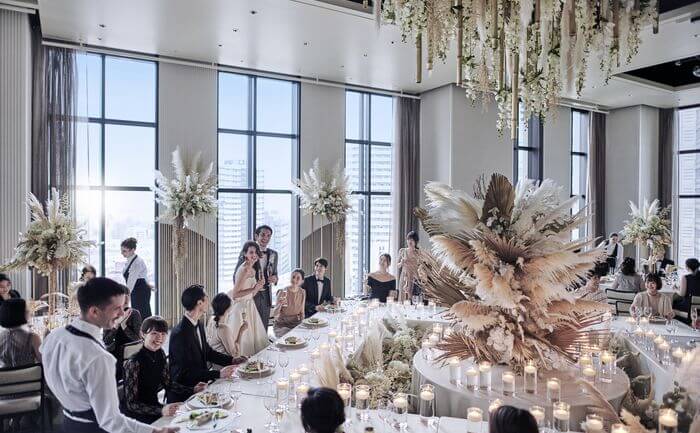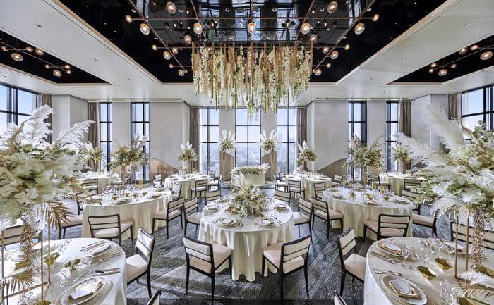 1フロア1バンケット、フロアごとに異なるテーマが設けられ、照明や調度品などすべてが独特の美意識で選ばれている。高層階のフロアを丸ごと貸し切りにしてふたりらしいウエディングを。