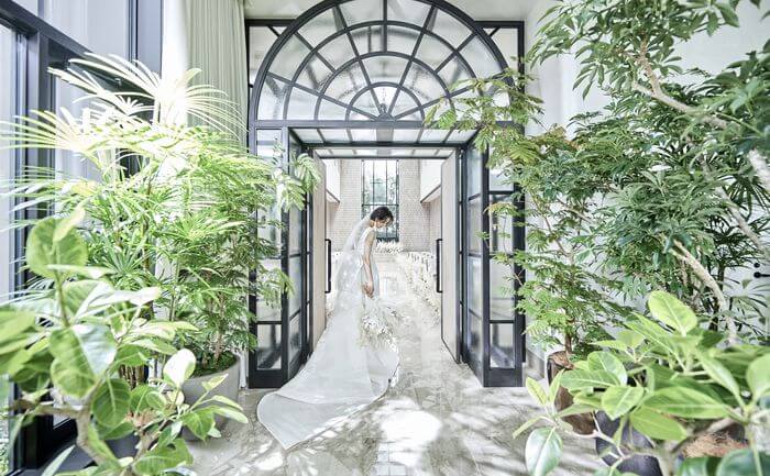 自然光に包まれたチャペルのエントランス。スタイリッシュでアート感溢れる空間に心ときめく。