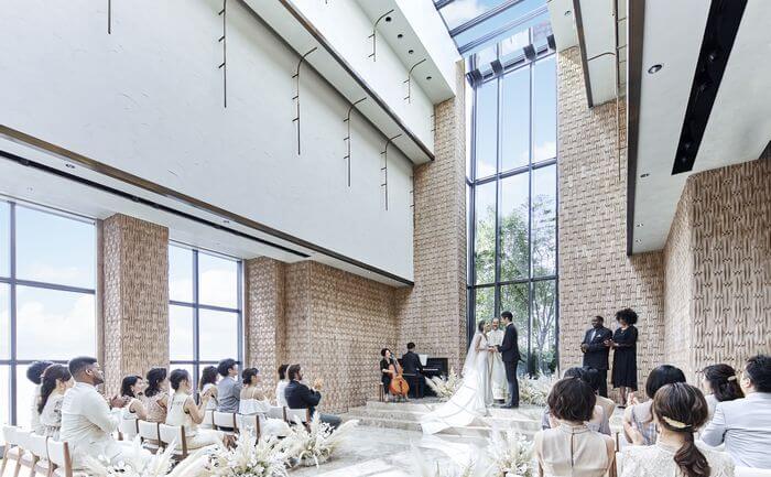 天井高10mの開放的なチャペル「ザ・ギャラリー」。天窓から射し込む光と、床や壁にもこだわったクリエイティブなデザインが特徴。白大理石のバージンロードは、花嫁のドレス姿を一層美しく見せる。