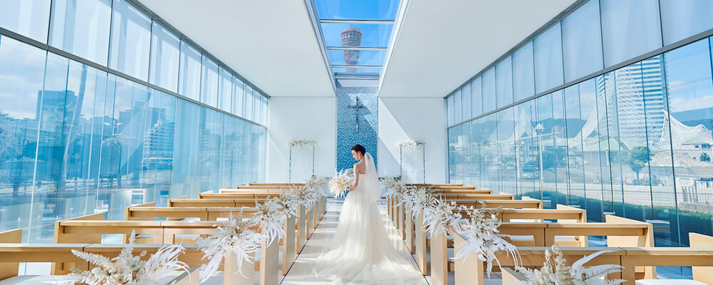 神戸のランドマークとして愛される「神戸メリケンパークオリエンタルホテル」は、三方を海に囲まれたロケーションが魅力。神戸らしい眺めは、「ゲストが寛げる雰囲気やおもてなしを大切にしたい」というふたりにぴったり。誓いの舞台は2つの独立型チャペルから選べる。「マリンホール」は、貝殻のようなフォルムが印象的な大聖堂。堂内は白を基調にし14mもの高さの天井が圧巻の荘厳な雰囲気。「アクアホール」は水の上に浮かぶガラスのチャペル。ミスト噴水での幻想的な演出が人気。どちらも感動的なひとときを実現してくれる。