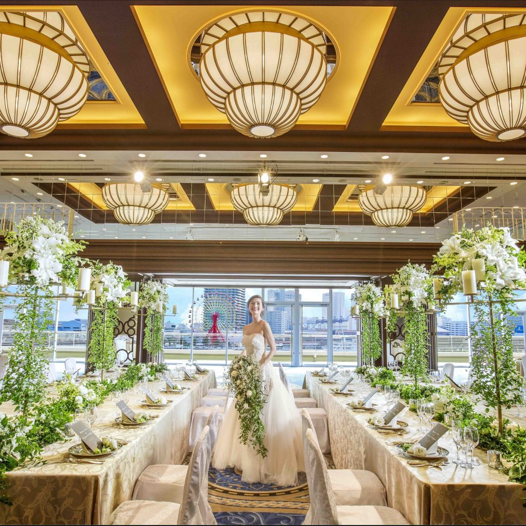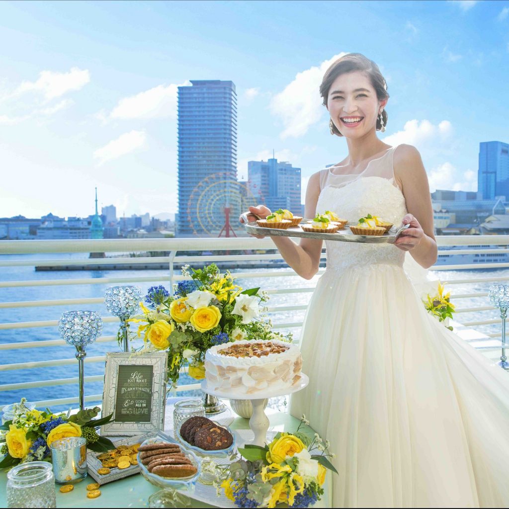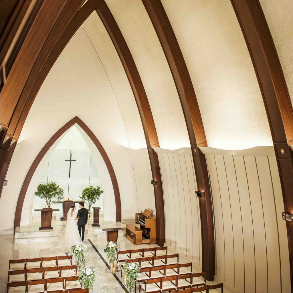 神戸のランドマークとして愛される「神戸メリケンパークオリエンタルホテル」は、三方を海に囲まれたロケーションが魅力。神戸らしい眺めは、「ゲストが寛げる雰囲気やおもてなしを大切にしたい」というふたりにぴったり。誓いの舞台は2つの独立型チャペルから選べる。「マリンホール」は、貝殻のようなフォルムが印象的な大聖堂。堂内は白を基調にし14mもの高さの天井が圧巻の荘厳な雰囲気。「アクアホール」は水の上に浮かぶガラスのチャペル。ミスト噴水での幻想的な演出が人気。どちらも感動的なひとときを実現してくれる。