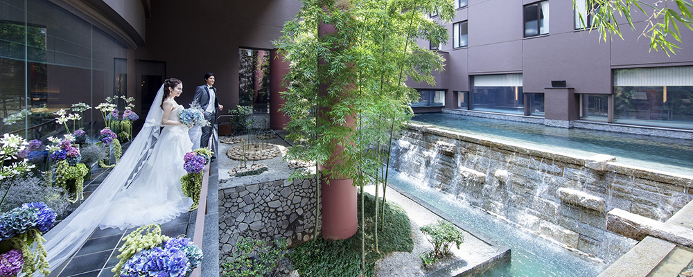 優れた近代建築物に贈られるBCS賞にも輝いたホテル。竹林が彩り、川・滝 が流れる美しい中庭での写真撮影も人気。神聖な門出を演出するチャペル「アルカンシェル」は、白を基調とした清廉な空間に、やさしい木の温もりを感じることができる。バンケットは天井も広さも贅沢に取った京都らしい格子風デザインにてジャパニーズモダンを演出しており、京都地産地消の食材にこだわった料理もまた絶品。ほっと安らげる「京都らしい」空間を感じながら最高の一日を。