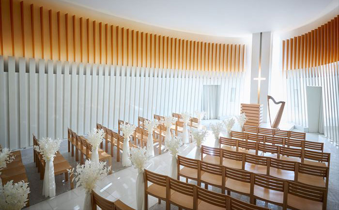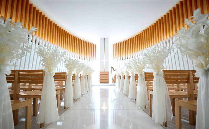 オーバルの曲線が開放感と自然のぬくもりを感じさせる独立型チャペル「チャペル フェアリア」
