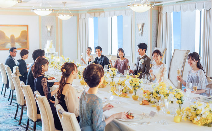名古屋駅真上という圧倒的なアクセスの良さに加え、眺望の美しさも随一。披露宴会場はすべて16階以上、1番高い51階の会場は地上200mを超え、名古屋の街並みや中央アルプスをはじめとする山々まで見渡せる。絶景のなか大切なゲストと過ごす時間は、記憶に残る特別なものに。