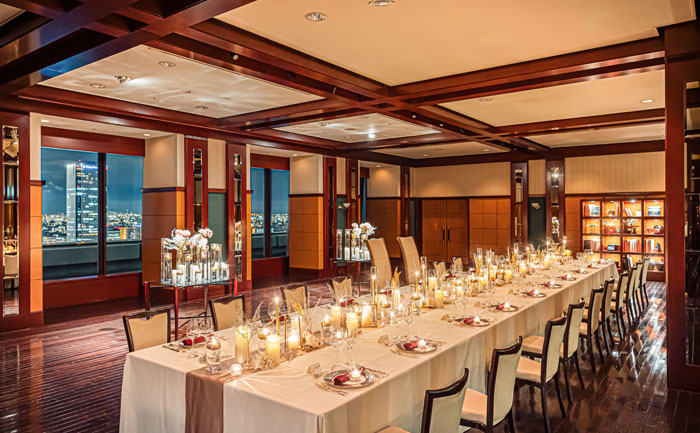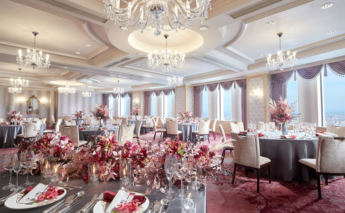 披露宴会場はすべて16 階以上に位置し、眺望の良さは随一。国際的なレセプションの舞台にもなるボールルームや、窓からの眺望が美しいラグジュアリーな会場、アットホームな少人数向けの会場など、6つの会場の中から人数やこだわりに合わせてセレクト。