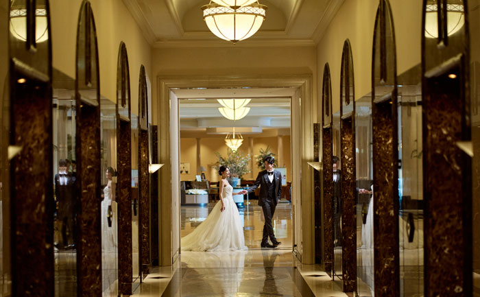 大理石が贅沢に使われたエレベーターホール。クラシカルな雰囲気のなか、ストーリー感のある1枚を。
