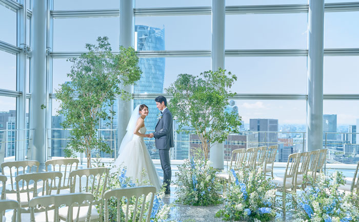 8mの天井高に全面ガラス張りの荘厳なセレモニースペース。大きな窓から臨む名古屋の街並みをふたり占め。