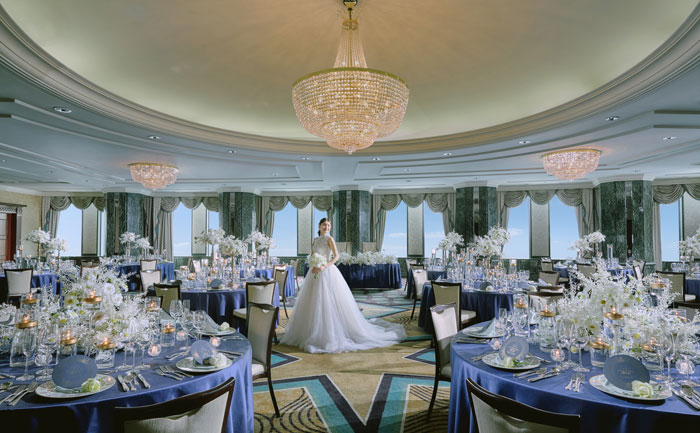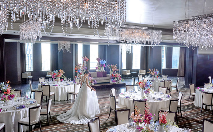 名古屋最大級の会場「タワーズボールルーム」。天井にはロブマイヤー社製のシャンデリアが連なりハイエンドな雰囲気が漂う。