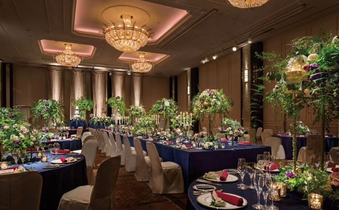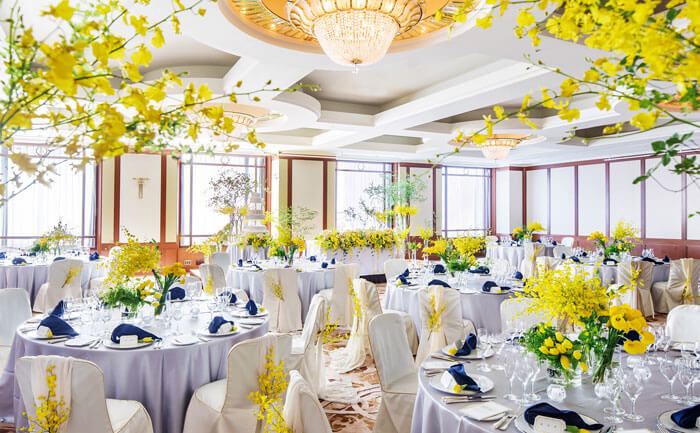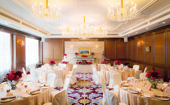 「暁雲」は天井高6m、格式を醸しだす壮麗なシャンデリアの輝きがひときわ印象的。