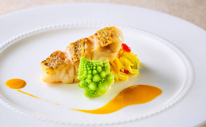 フランス料理「ロンド」より[南フランスへの誘い]姫鯛のポワレ 南フランス風パスタのリゾットとロマネスコ 貝の旨みのトマトソース