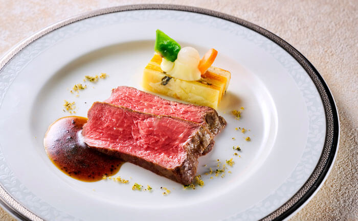 フランス料理「ソナタ」より[至福のメインディッシュ]国産牛サーロインの網焼き かぼちゃとポテトのミルフィーユ 木の実といろいろなスパイスとトリュフが香るソース