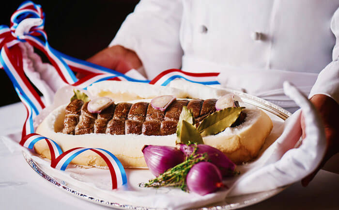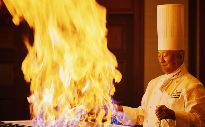 料理に香りを纏わせる華麗な技、フランベサービス。シェフが炎を操る技にゲストからは感嘆の声も。