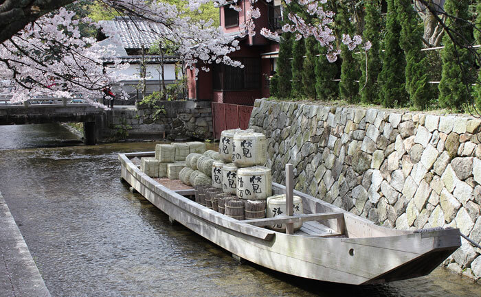 近くを流れる高瀬川は京都の舟運が盛んだったことを物語る。桜の名所としても知られ、フォトスポットにもおすすめ。