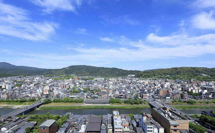 鴨川の向こうに京都の街と東山三十六峰の山並みを一望する好ロケーション。