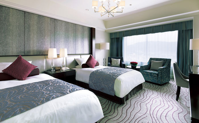 モダンな佇まいの中に、和紙を張り込んだ屏風など、日本の伝統的な意匠を取り入れた落ち着いた16F客室。