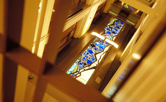 吹き抜けの客室フロア7階に飾られたグラスアートは、グラスアーティスト三浦啓子氏の作品「紫の上讃歌」