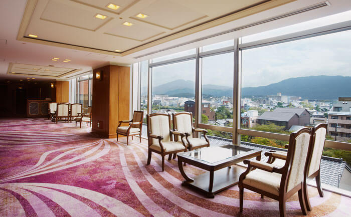 5階の親族控室前は、大きな窓から東山の景色を望む、開放感あふれるフロア。東山や京都の街並みを背景に撮影を。