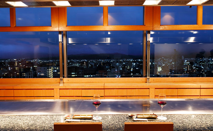 昼は西山、夜は街の夜景を楽しめる鉄板焼「ときわ」のロングカウンター。