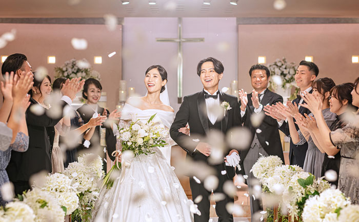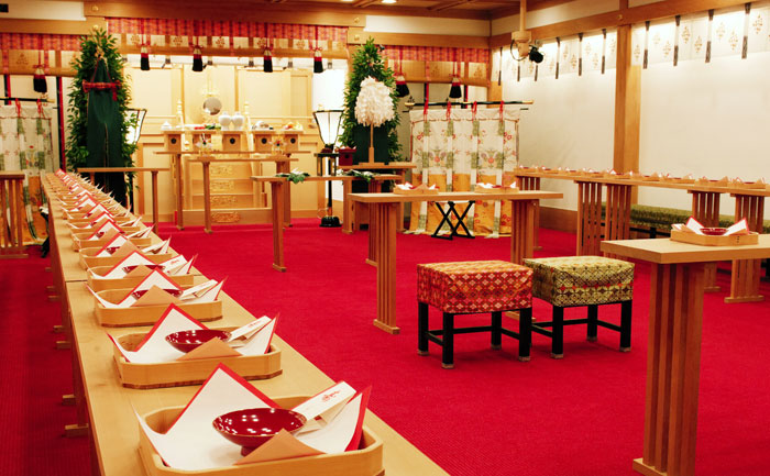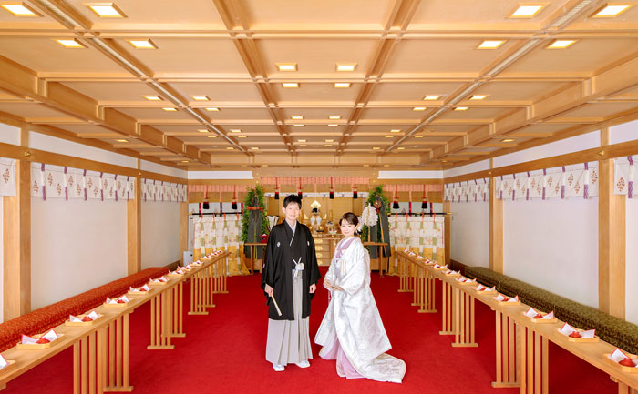 いにしえより続く、由緒正しく壮麗で心豊かな「和」の挙式。雅楽の荘厳な調べに導かれ、心を紡ぐ厳かな神前式を。