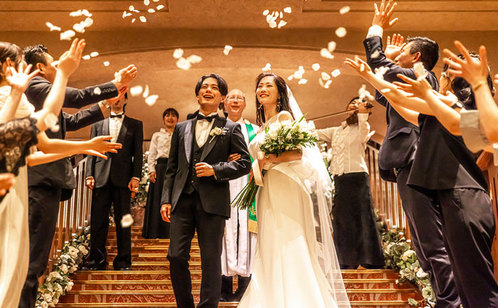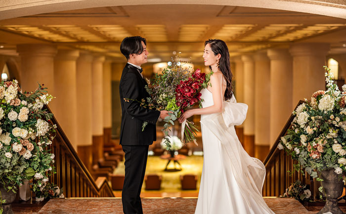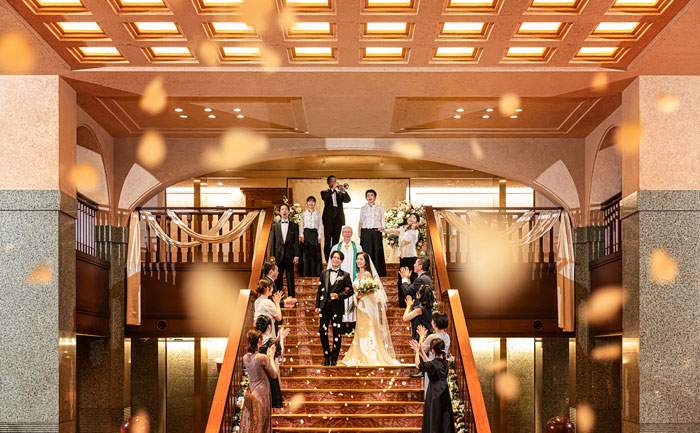 大階段を舞台にしたドラマティックな挙式は、まるで映画のワンシーンのよう。