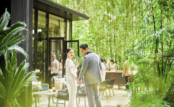 【ザ テラスルーム】緑に囲まれたプライベートテラスを持つ独立型バンケット。水音や風を感じる環境が魅力。