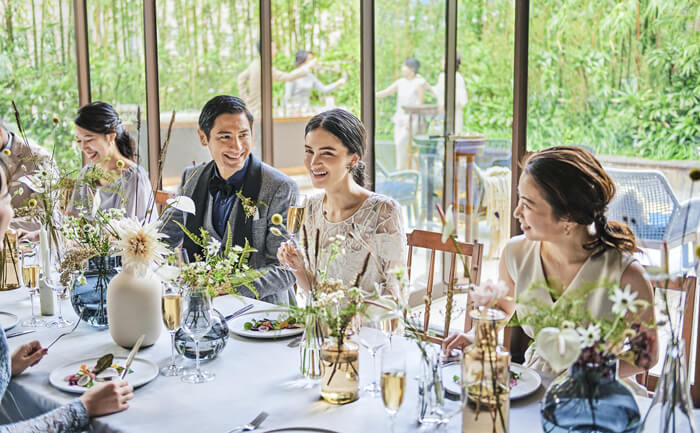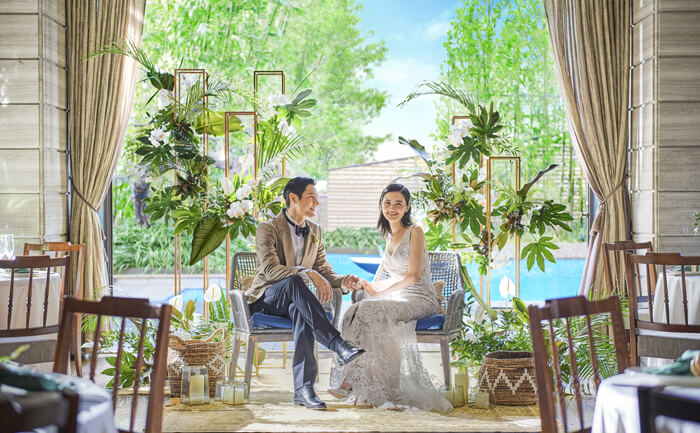 【ザ ロイヤルボールルーム イースト】リゾートを思わせる清々しい空気と癒しと寛ぎに満ちた雰囲気にふたりもゲストもリラックス気分で