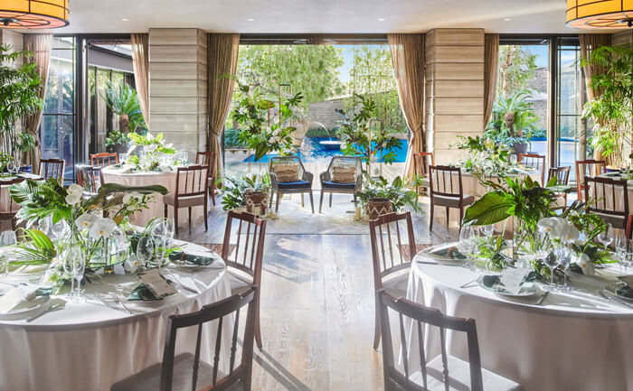 【ザ ロイヤルボールルーム イースト】ナチュラルなコーディネートにテーブルレイアウトも自由自在。テラスでの開放的なひとときも楽しめる。