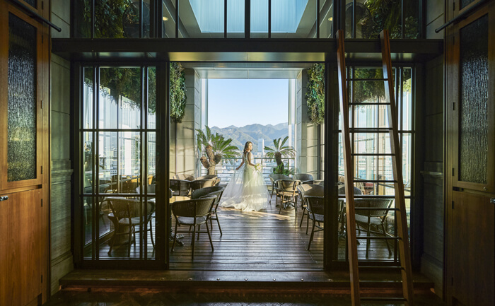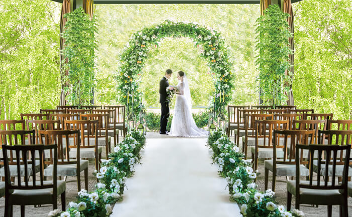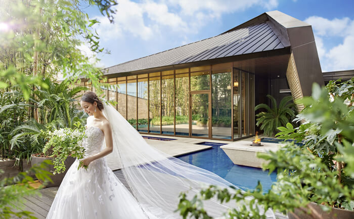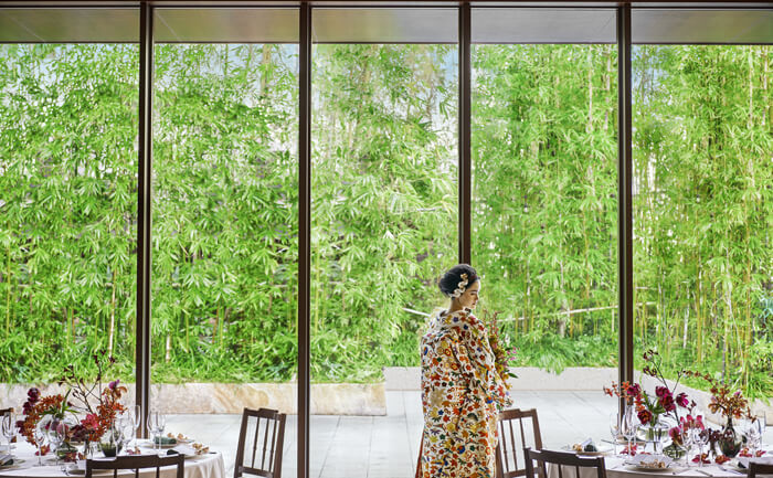 竹林を配したテラスを望むロケーション。ドレスはもちろん和装も素敵に映え、花嫁の美しさを引き立てる。