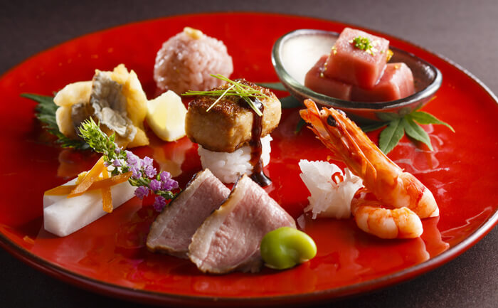 フレンチをベースに和の伝統を活かし、地産地消にこだわったジャパニーズキュイジーヌの目にも鮮やかな前菜。