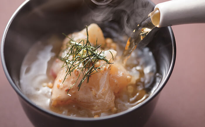 お祝いの席にふさわしいおめでたい食材・鯛の切り身こだわりの出汁を注いでいただく「鯛茶漬け」。